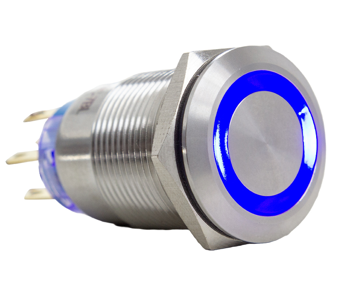Botão metálico momentâneo de alta resistência com iluminação de LED. Corpo de aço inox natural e vedação contra entrada de líquidos.