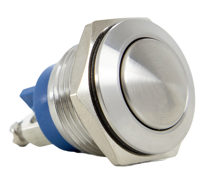 Botão metálico momentâneo arredondado de alta resistência, parafuso. Corpo de aço e vedação contra entrada de líquidos. Grau de proteção IP65.