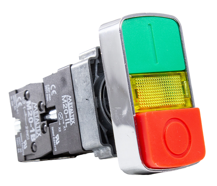 Botão Duplo Iluminado Metálico 22mm – 220VCA – Verde/Vermelho – 1NA+1NF