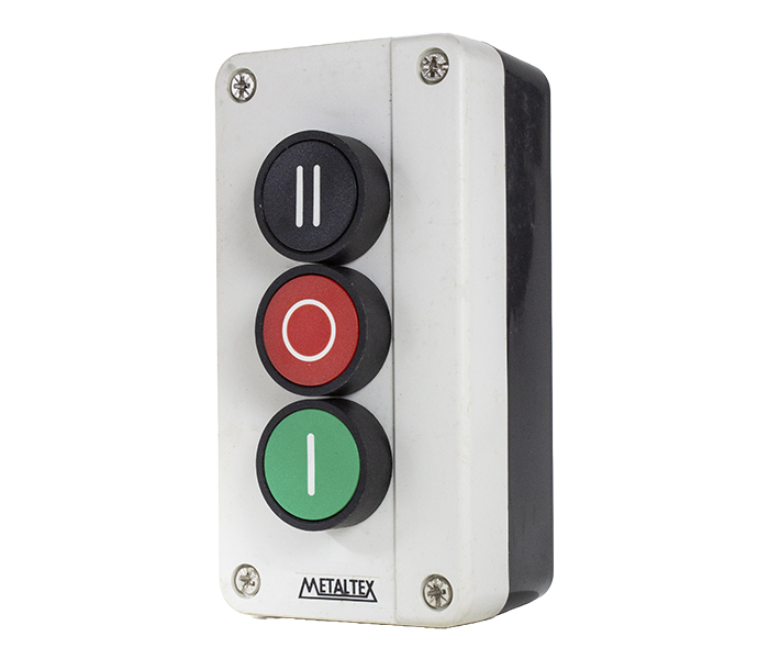 Caixa plástica com um botão verde, um preto (contato NA) e um vermelho (contato NF). Indicado para ligar com velocidade 1, desligar e ligar com velocidade 2. Grau de proteção IP65.