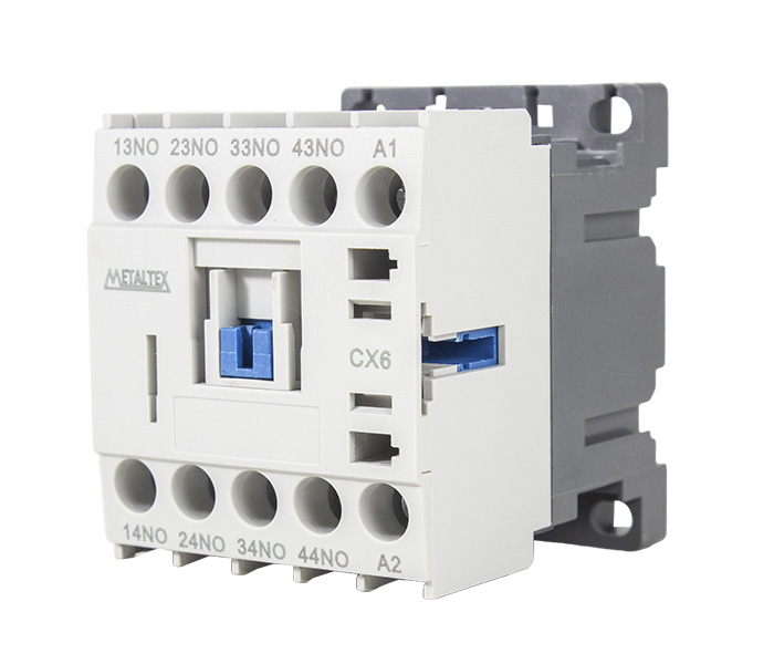 Contator auxiliar linha CX com 4 contatos do tipo NA. Possui bobina de acionamento em 220VCA e capacidade de contato de 7A em categoria AC3 em 220V e 20A em categoria AC1. De acordo com as normas IEC 60947-4-1 e EN 60947-4-1.